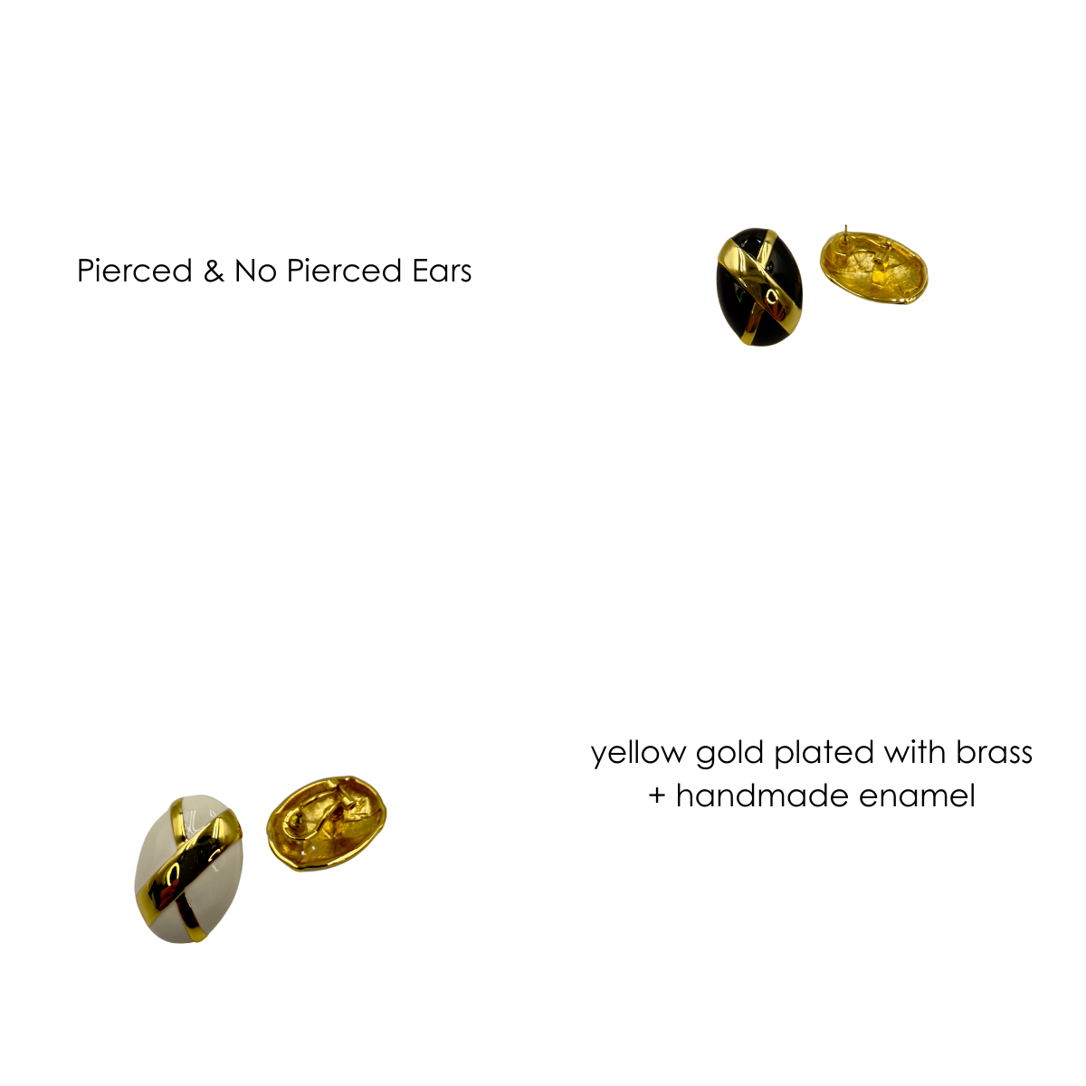 • Metal: chapado en oro amarillo con latón + esmalte blanco o negro hecho a mano.