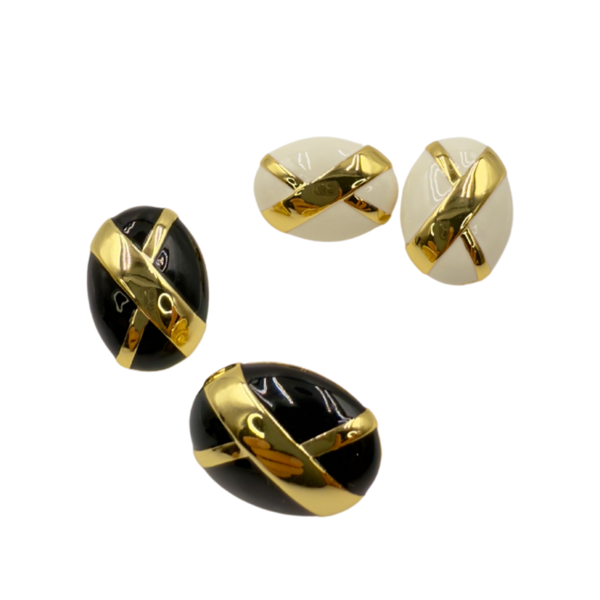 Estos pendientes redondos combinan a la perfección elegancia refinada con estilo audaz, con un llamativo esmalte blanco y negro o negro engastado en latón bañado en oro de 18 k. Ligeros pero llamativos, añaden un toque distintivo de personalidad y sofisticación a cualquier atuendo. Ideales para usar a diario o combinados con un collar a juego para lograr un look coordinado, estos pendientes son una declaración sofisticada, ya sea que se usen solos o como parte de un conjunto.